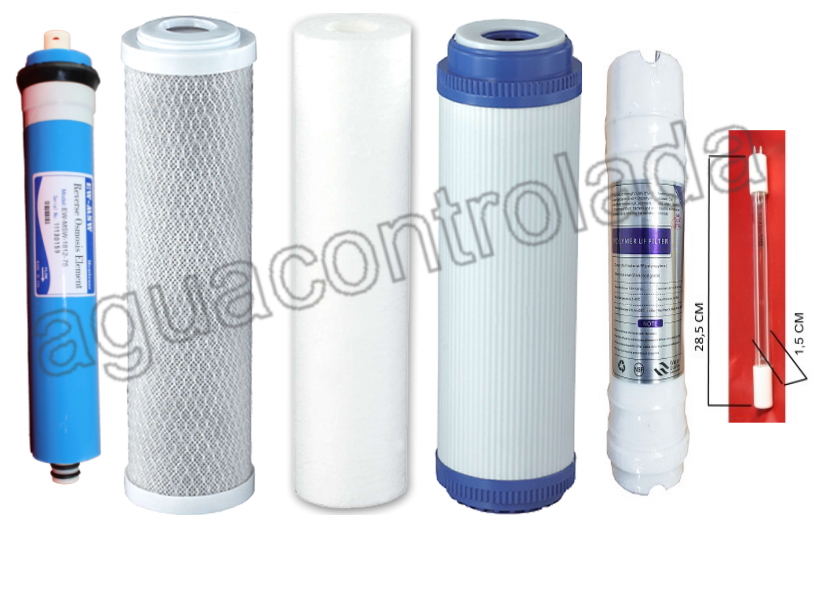 Pack 6 etapas : 3 filtros + Membrana 100 GPD + Postfiltros Carbón Quick Conection + Lampara Rayos UVA