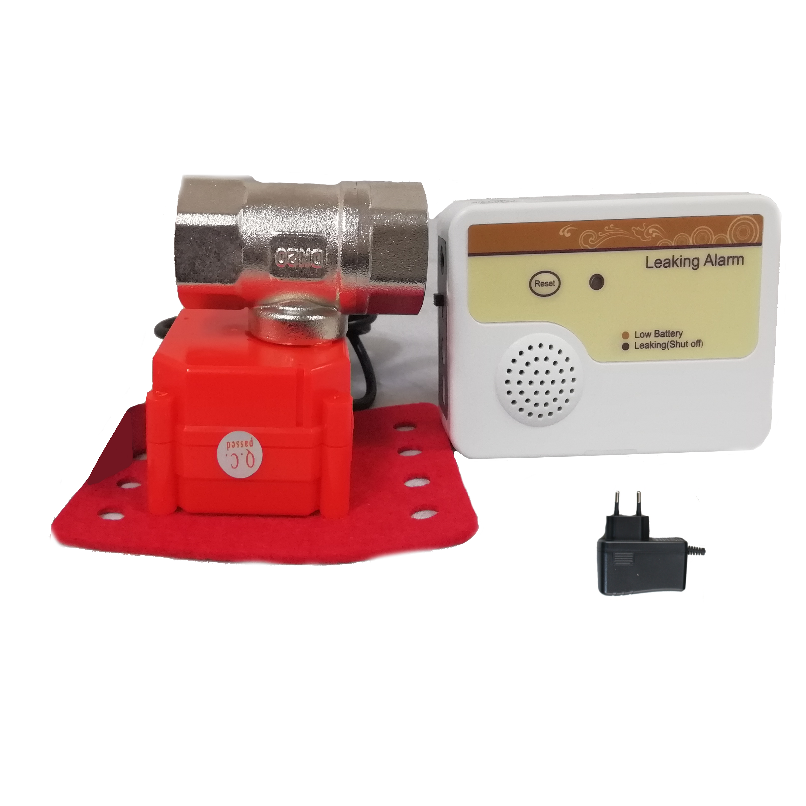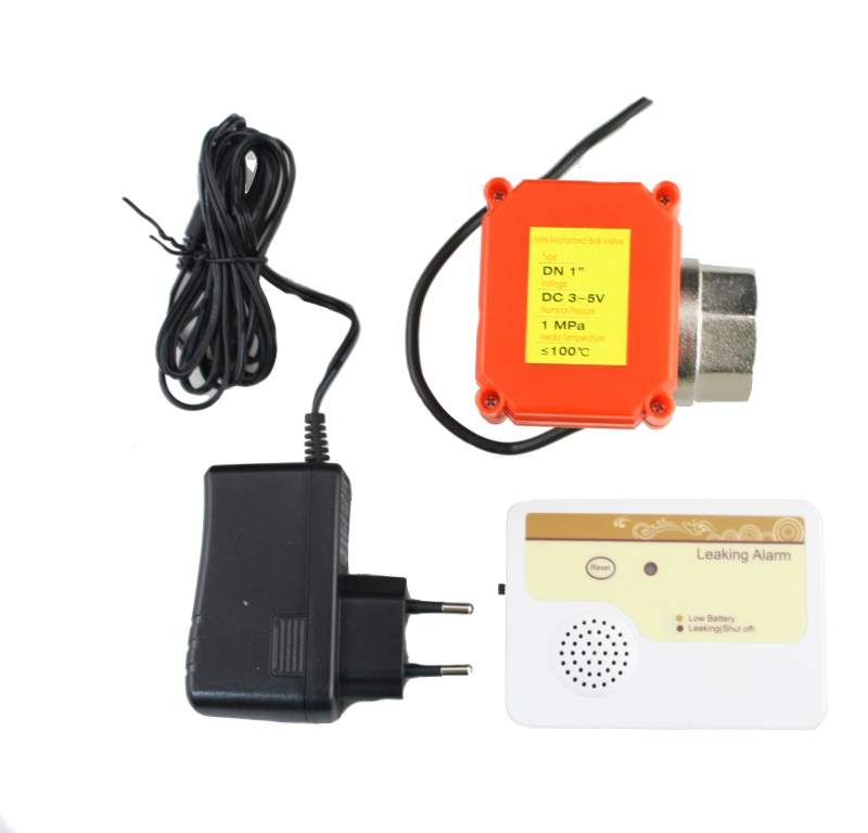 Sistema anti fugas de agua en la vivienda, empresa o oficina con alarma indicadora. Se instala en la tubería de entrada intercalando el equipo. El sensor al detectar una fuga  da la orden de cerrar la válvula de bola mediante un  rotor eléctrico,  cortando totalmente el agua e impidiendo la inundación. A su vez  activa la alarma visual y sonora. La válvula de bola no vuelve a su posición original por falta de corriente eléctrica impidiendo el paso del agua hasta que el usuario reinicie el dispositivo.