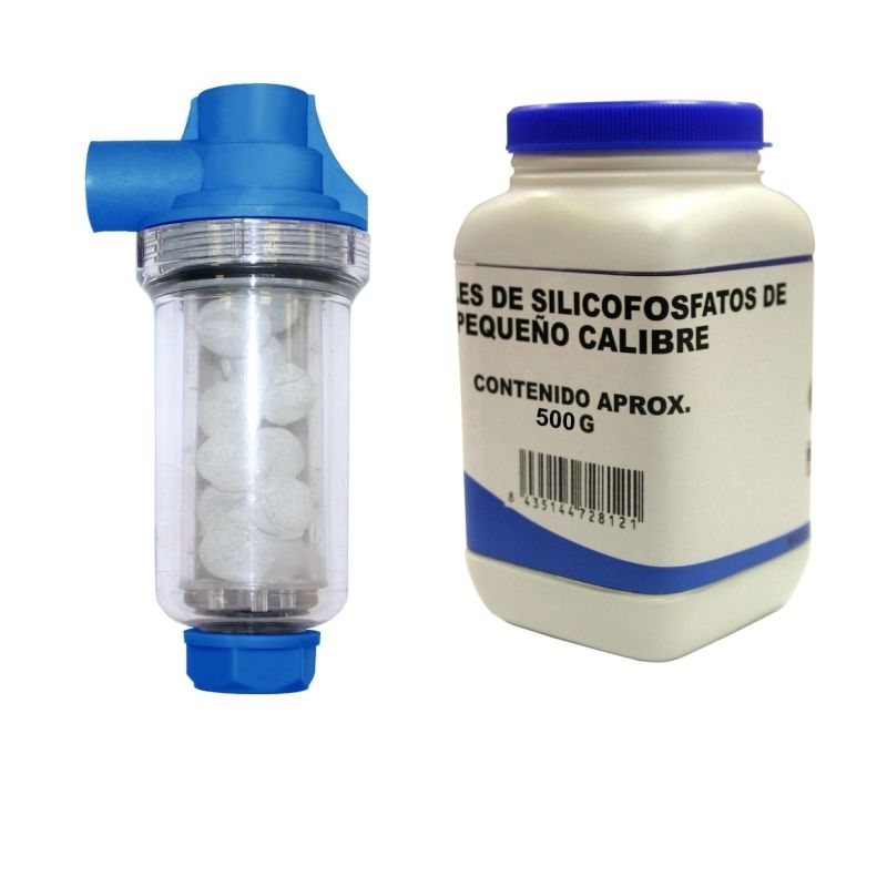 La cal es un mineral cuya principal propiedad es su alto poder incrustante. Hay diferentes métodos de tratar la cal. Este Filtro actua sobre la Cal inhibiendo su poder incrustante obteniendo una agua blanda.  El filtro se encuentra relleno de silicofosfatos, un mineral muy parecido a la sal común utilizada en los lavaplatos. El agua al pasar por su interiór va disolviendo poco a poco las bolas de silicofosfatos que al mezclarse con el agua producen un agua blanda, donde la cal no se incrusta en los depósitos, calderines, calderas, termos , lavadoras , lavaplatos  ni en las tuberías. La colocación es muy simple, no requeriendo de técnico especialista debido a que se intercala entre el serpentin y la caldera o termo o a la entrada del electrodoméstico.