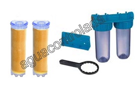 Calificación: Sin calificaciónKit pensado para pequeñas producciones de agua sin cal. Usos habituales en pequeños jardines, peceras, acuarios, pre-etapa de osmosis inversa, laboratorios, consultas dentales. Las resinas cationicas captan todas las moleculas de la cal, dejando pasar solo agua sin cal. Cartucho multiusos. Filtro de muy facil instalación y mantenimiento y coste. El recambio se puede comprar suelto siendo una rápida y facil sustitución. Porta - cartuchos con aplique para fijar a pared. Conexión de salida 1" . Mediante reducciones se puede reducir a las medidas mas comunes 3/4" - 1/2" - 3/8" y 1/4 . Si tiene alguna llamenos para su aclaración.